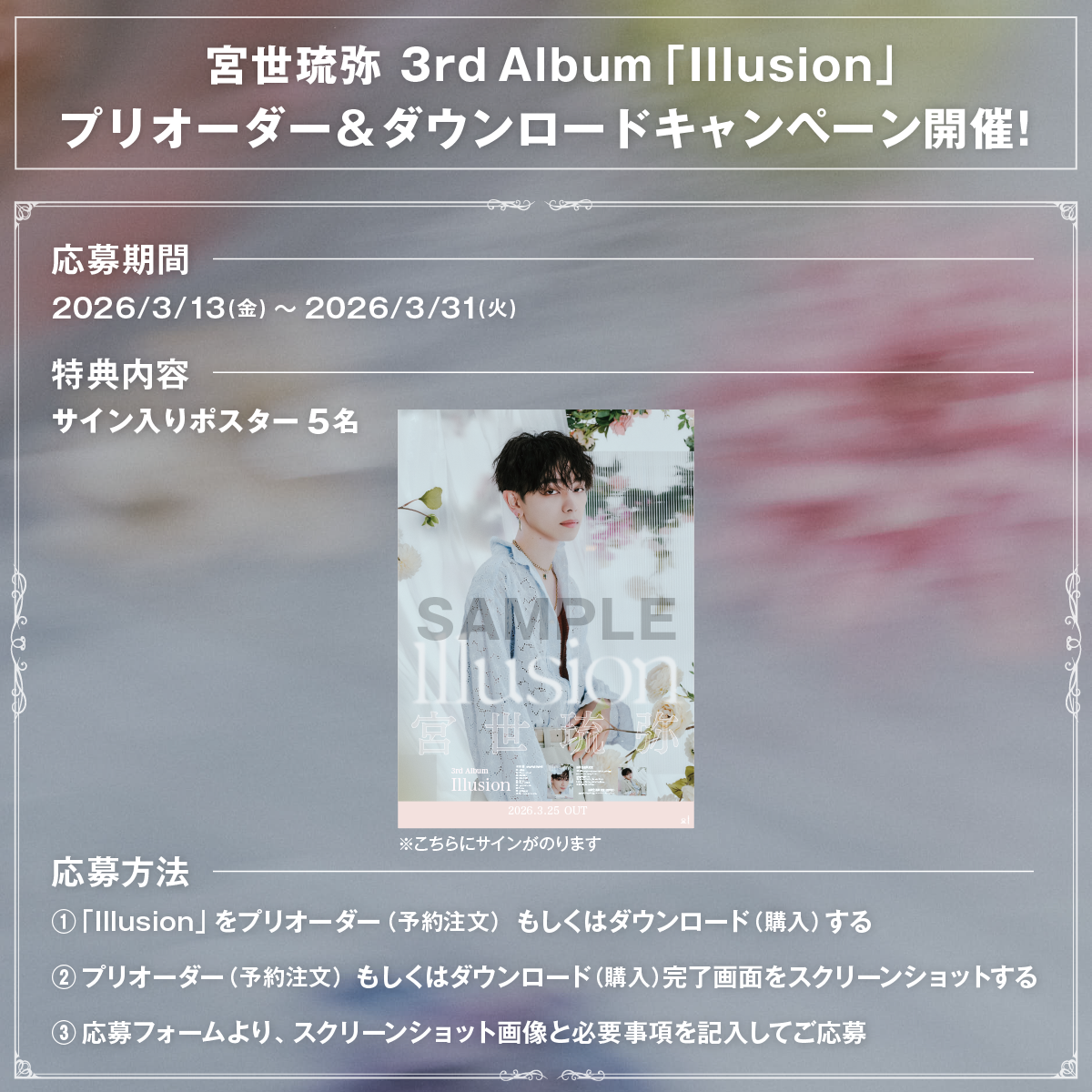 3月25日(水)に配信がスタートする宮世琉弥「Illusion」のプリオーダー&ダウンロードキャンペーンの実施が決定いたしました。
