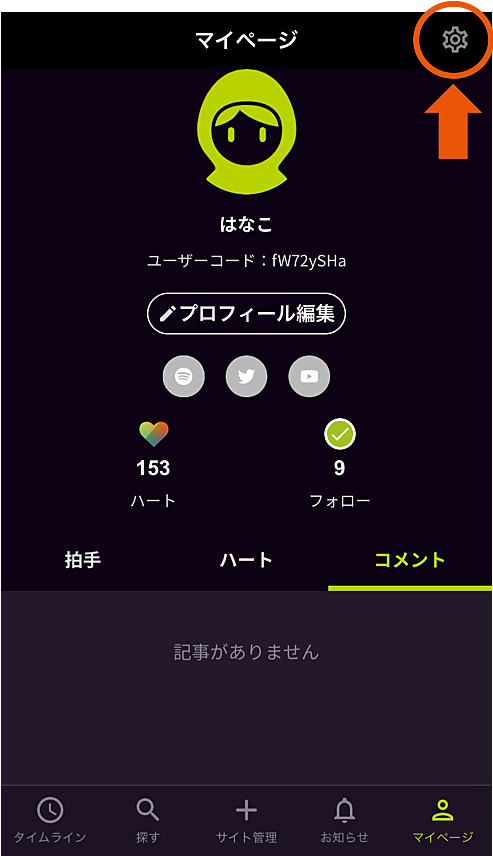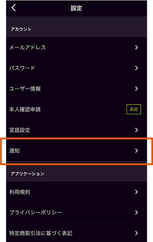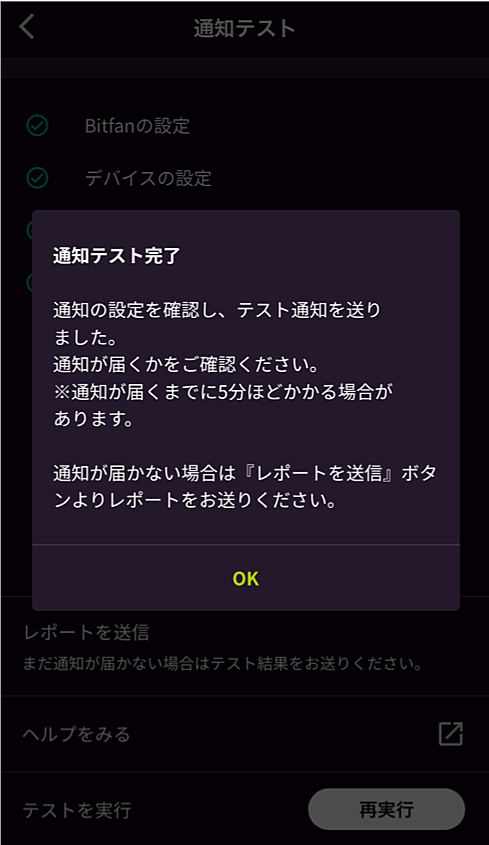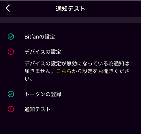 Bitfanアプリのマイページ>設定(右上の歯車マーク)>通知 を確認。